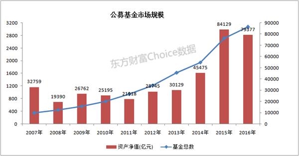 东方财富choice数据显示,截至6月30日,公募基金市场规模为79377亿元,比2015年末的84129亿元,缩水幅度5.65%。